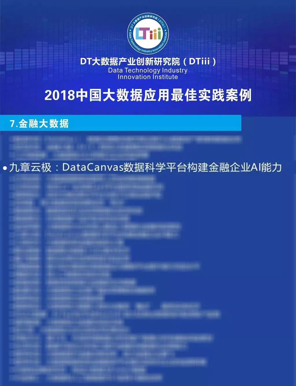 2018年,DTiii通过资本、甲方、研究院所等多个渠道,根据技术创新、产品成熟度、应用广度和深度、未来市场潜力等多个维度,经过政、产、学、研、用上百名一线业内专家评选,最终遴选出200个行业最佳实践案例。